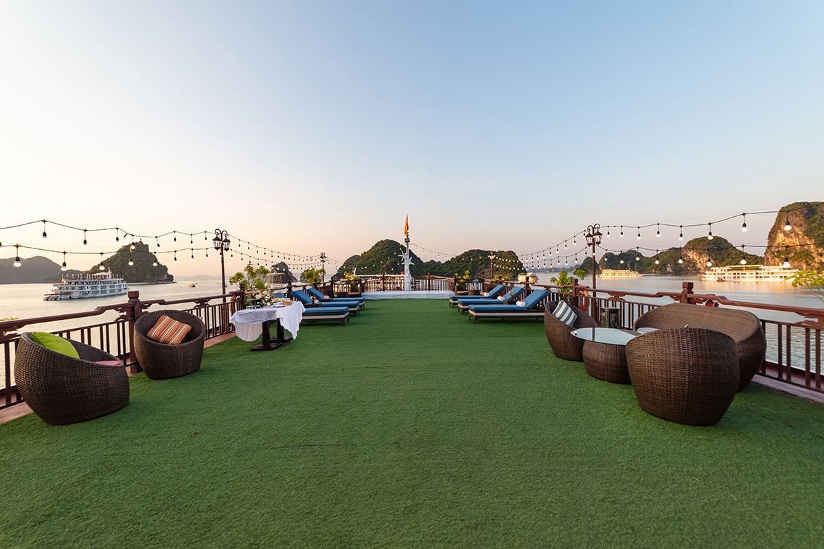 Có lẽ điểm nhấn của du thuyền Hạ Long Amanda 5 sao này đó chính là sundeck (boong tắm nắng) ở tầng thượng có thiết kế mở. Sundeck được trải thảm cỏ xanh nhân tạo mang tới không gian tươi mát, cùng với ghế dài cho du khách thư giãn tắm nắng. Tại sundeck du khách còn được tham gia nhiều trải nghiệm thú vị như: Ngắm cảnh hoàng hôn lãng mạn, tiệc trà chiều hay check-in sống ảo.