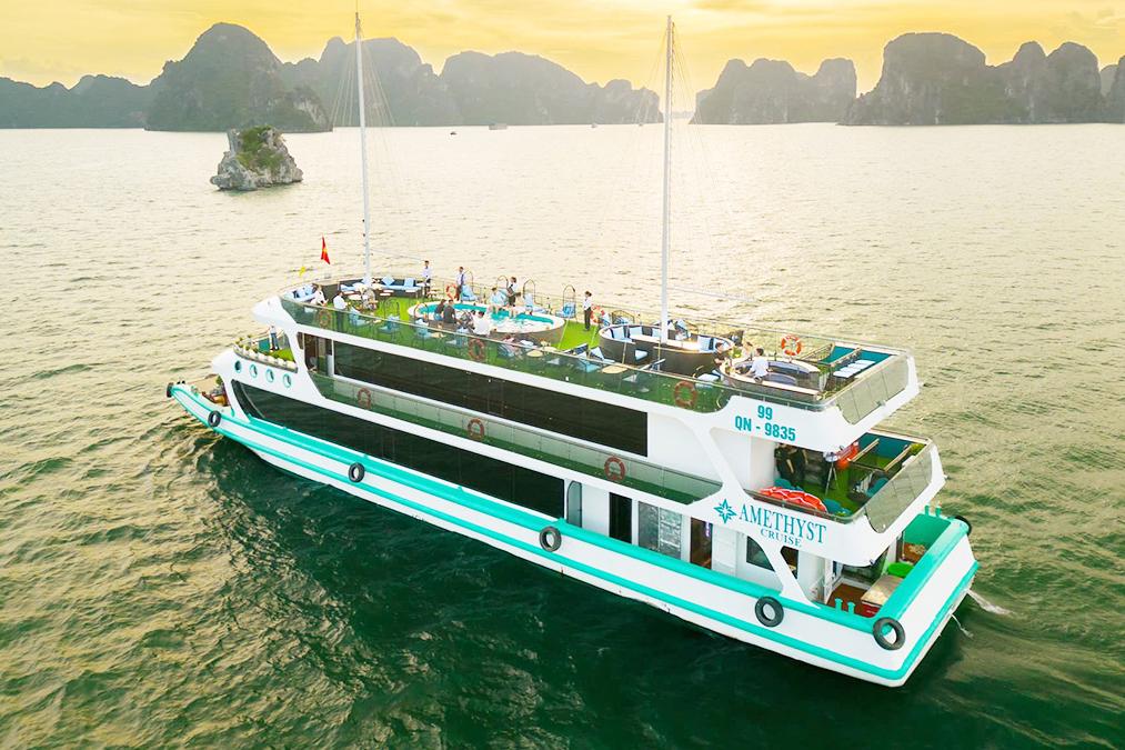 Được xem như một "khách sạn 5 sao nổi" lịch lãm giữa lòng Di sản, Du thuyền Nhà hàng Amethyst là lựa chọn lý tưởng cho hành trình khám phá Vịnh Hạ Long trọn vẹn trong ngày. Với chuẩn mực phục vụ đẳng cấp, lịch trình tinh tế kéo dài 8 tiếng và hải trình độc đáo, Amethyst không chỉ đưa bạn đến với những danh thắng nổi tiếng như hòn Móng Tay, hang Sửng Sốt, hang Luồn... mà còn mang đến trải nghiệm nghỉ dưỡng thượng lưu ngay trên sóng nước.