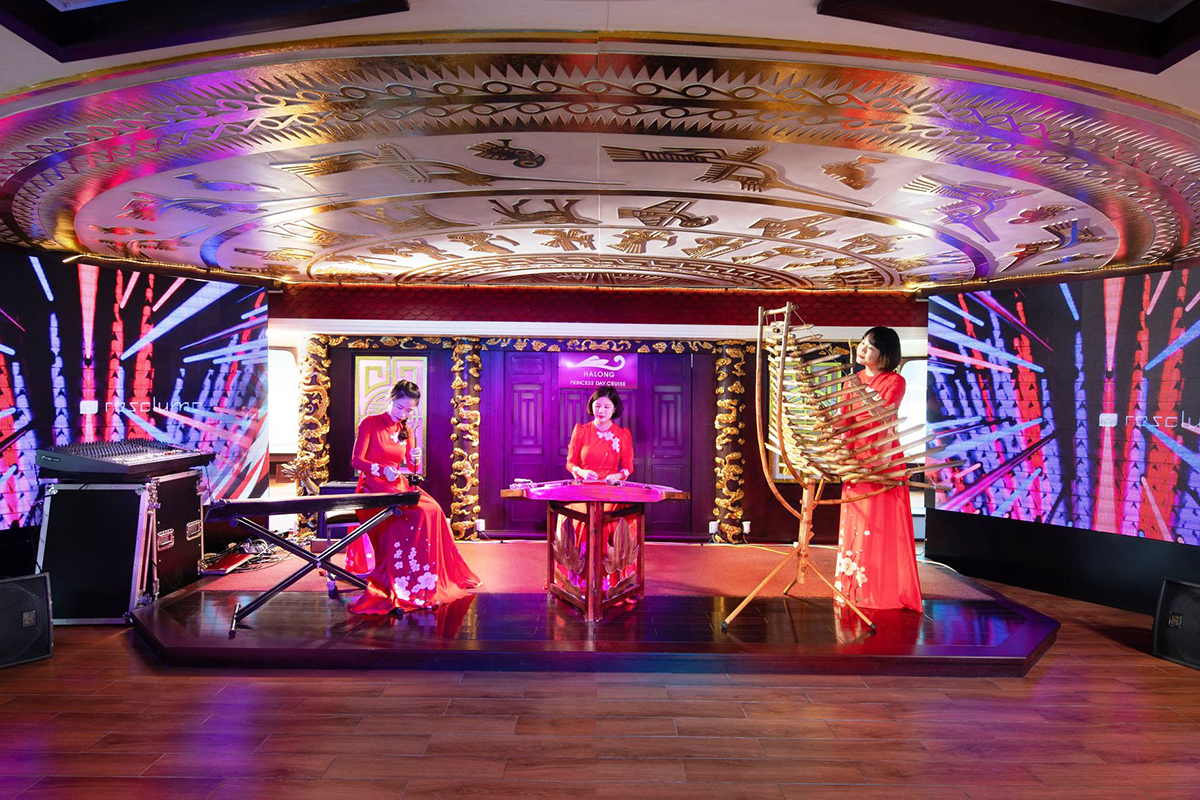 Giao Hưởng Âm Nhạc Sống: Suốt hành trình, đặc biệt trong bữa tối, du khách sẽ được thưởng thức những bản nhạc du dương, lãng mạn từ ban nhạc chuyên nghiệp, tôn thêm vẻ lãng mạn và sang trọng.