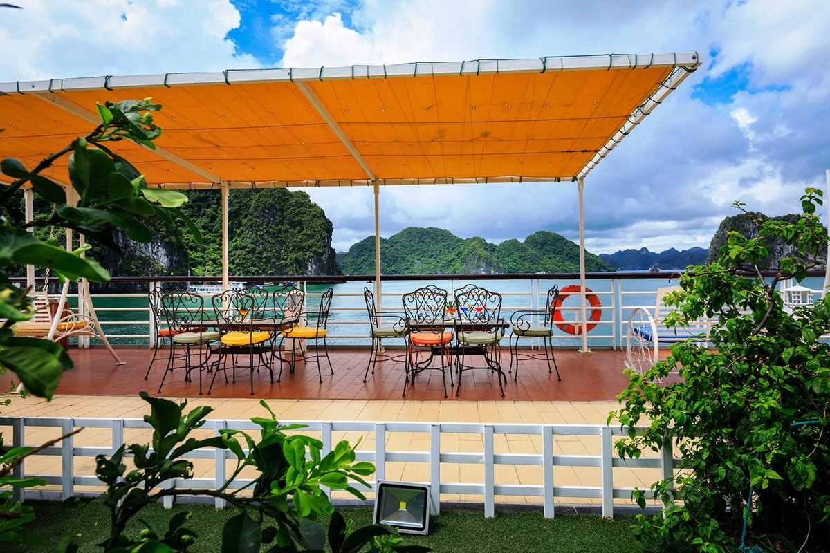 Thư Giãn Tại Sky Bar Trên Sundeck: Tận hưởng không khí trong lành và tầm nhìn toàn cảnh ngoạn mục 360 độ tại khu vực Sky Bar trên boong thượng – nơi lý tưởng để nhâm nhi một ly cocktail và đắm mình vào khung cảnh thiên nhiên hùng vĩ.