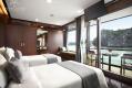 Sở hữu diện tích phòng rộng rãi và tầm nhìn hướng ra vịnh, Exclusive Suite là hạng phòng cao cấp và sang trọng nhất trên du thuyền với các tiện nghi hiện đại cùng bồn tắm sục jacuzzi riêng biệt.