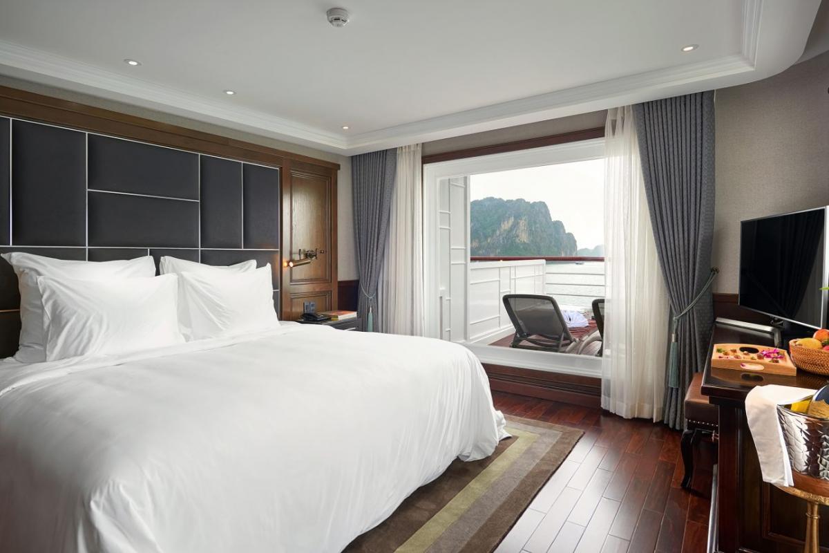 Phòng Grand Balcony Suite có vị trí ở cuối tàu tầng 2, là lô góc có view ngắm cảnh đẹp theo hai hướng. Hạng phòng này gồm tất cả 2 phòng với 1 giường to rộng lớn. Trong phòng được thiết kế có ban công rộng cho quý khách tắm nắng và ngắm cảnh đẹp trên vịnh. Đồ nội thất được thiết kế vô cùng tinh xảo và đầy đủ tiện nghi sang trọng. Buồng tắm gồm cả bồn tắm nằm và đứng cho quý khách thư giãn.
